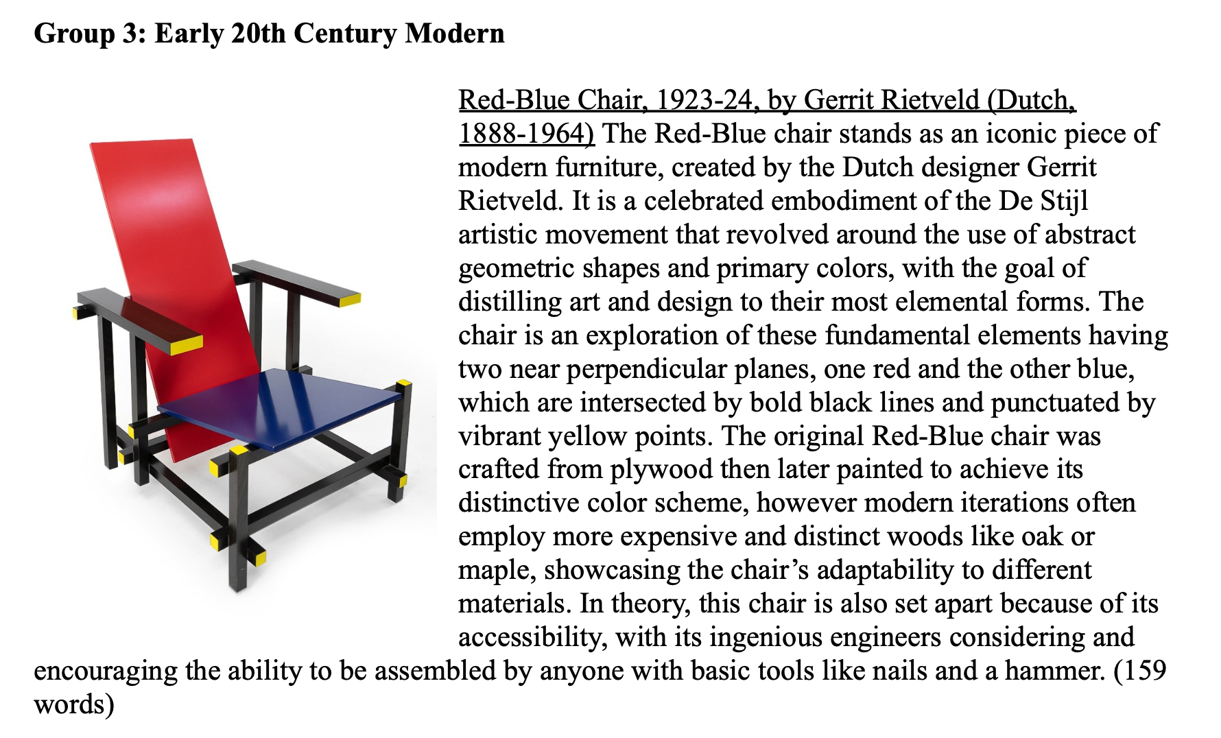 The second image reads, “Red-Blue Chair, 1923-24, by Gerrit Rietveld (Dutch, 1888-1964) The Red-Blue chair stands as an iconic piece of modern furniture, created by the Dutch designer Gerrit Rietveld. It is a celebrated embodiment of the De Stijl artistic movement that revolved around the use of abstract geometric shapes and primary colors, with the goal of distilling art and design to their most elemental forms. The chair is an exploration of these fundamental elements having two near perpendicular planes, one red and the other blue, which are intersected by bold black lines and punctuated by vibrant yellow points. The original Red-Blue chair was crafted from plywood then later painted to achieve its distinctive color scheme, however modern iterations often employ more expensive and distinct woods like oak or maple, showcasing the chair’s adaptability to different materials. In theory, this chair is also set apart because of its accessibility, with its ingenious engineers considering and encouraging the ability to be assembled by anyone with basic tools like nails and a hammer. (159 words)