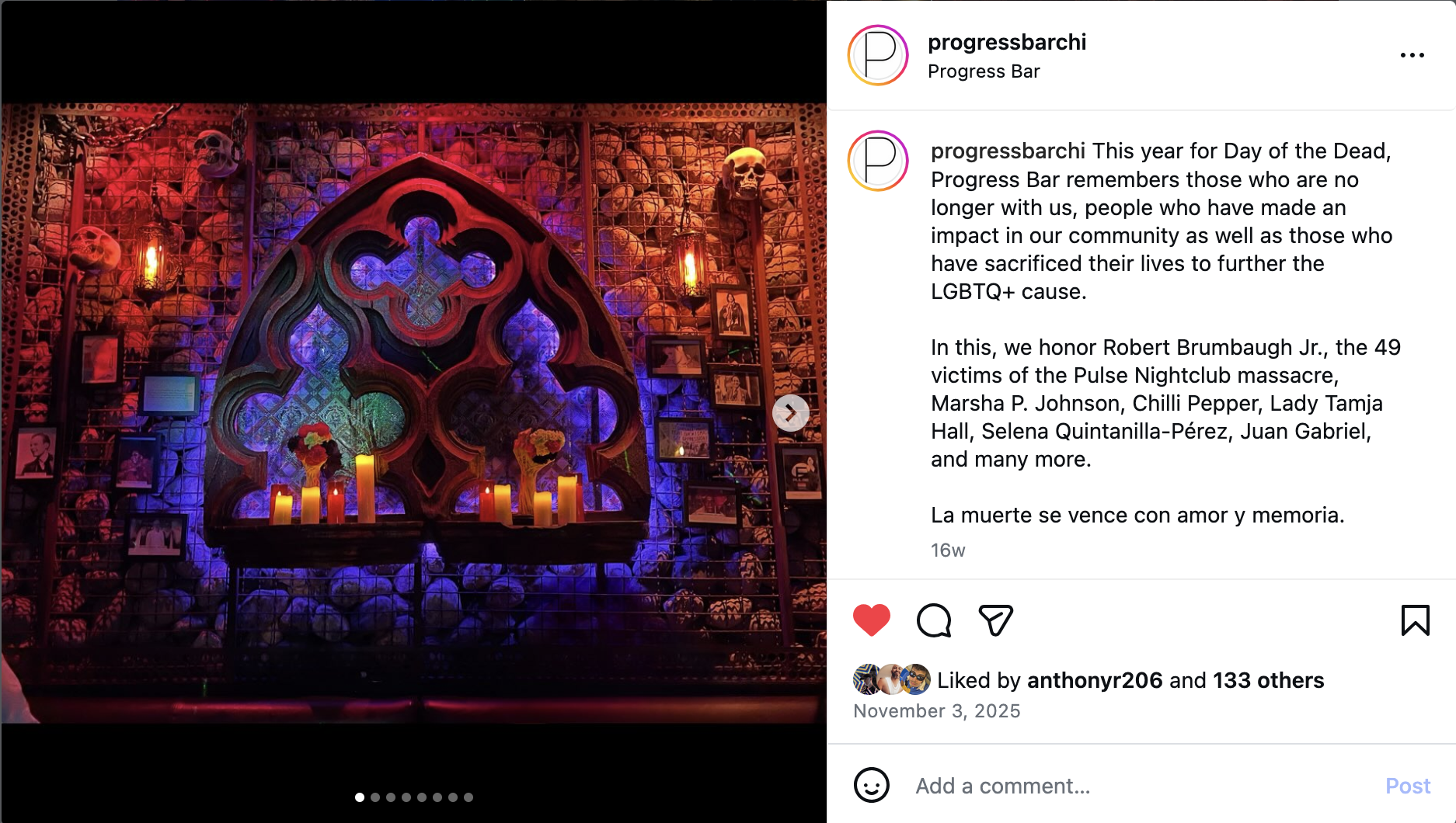 For Día de los Muertos, I helped decorate the bar and wrote the copy for a post honoring the shrine we created for the holiday. The majority of Progress Bar's staff and customer base is Latino, so I approached this with real care, researching the cultural significance of the holiday and consulting with colleagues and community members to make sure the content was accurate and respectful rather than just visually appealing. The reception from that post was one of the most rewarding moments I've had in this role.