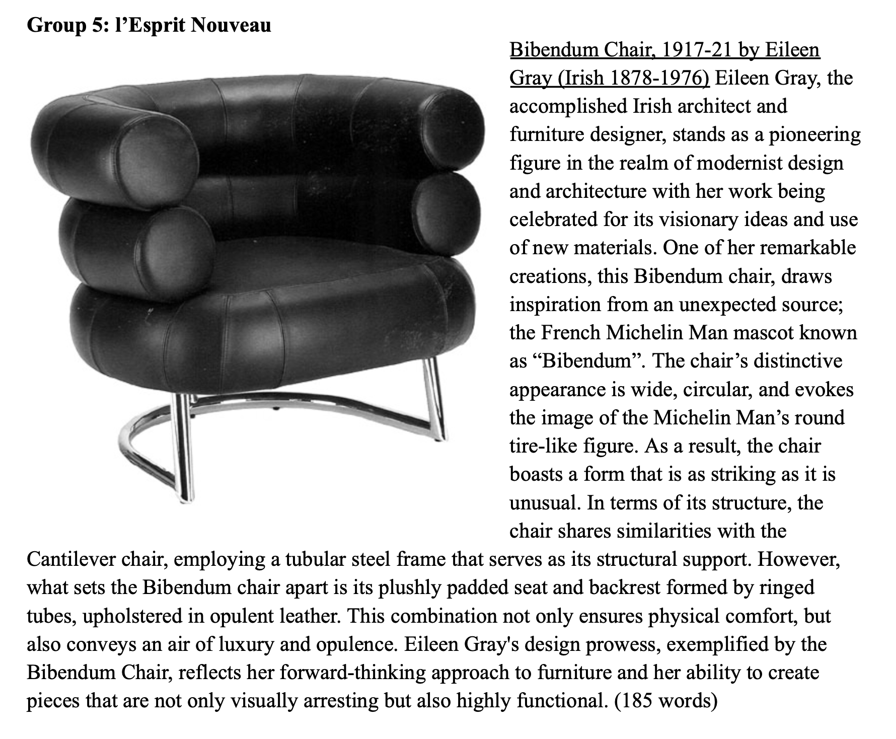 For this piece I wrote, “Bibendum Chair, 1917-21 by Eileen Gray (Irish 1878-1976) Eileen Gray, the accomplished Irish architect and furniture designer, stands as a pioneering figure in the realm of modernist design and architecture with her work being celebrated for its visionary ideas and use of new materials. One of her remarkable creations, this Bibendum chair, draws inspiration from an unexpected source; the French Michelin Man mascot known as “Bibendum”. The chair’s distinctive appearance is wide, circular, and evokes the image of the Michelin Man’s round tire-like figure. As a result, the chair boasts a form that is as striking as it is unusual. In terms of its structure, the chair shares similarities with the Cantilever chair, employing a tubular steel frame that serves as its structural support. However, what sets the Bibendum chair apart is its plushly padded seat and backrest formed by ringed tubes, upholstered in opulent leather. This combination not only ensures physical comfort, but also conveys an air of luxury and opulence. Eileen Gray's design prowess, exemplified by the Bibendum Chair, reflects her forward-thinking approach to furniture and her ability to create pieces that are not only visually arresting but also highly functional. (185 words)”