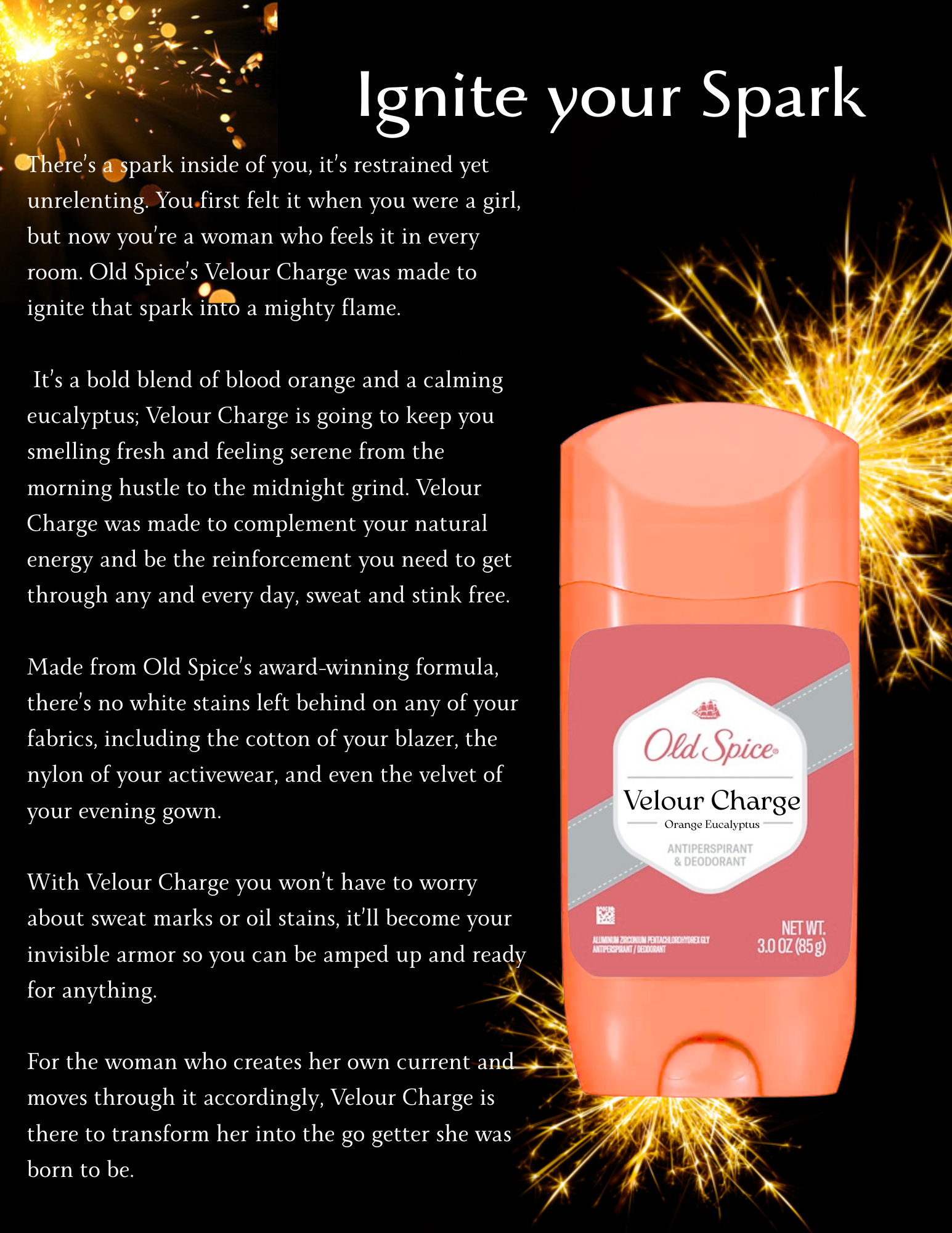 The long copy reads, “There’s a spark inside of you, it’s restrained yet unrelenting. You first felt it when you were a girl, but now you’re a woman who feels it in every room. Old Spice’s Velour Charge was made to ignite that spark into a mighty flame.